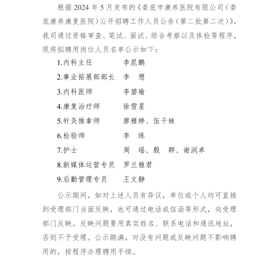 婁底市康養(yǎng)醫(yī)院有限公司(婁底康養(yǎng)康復(fù)醫(yī)院)第二批第二次公開招聘擬錄用人員公示