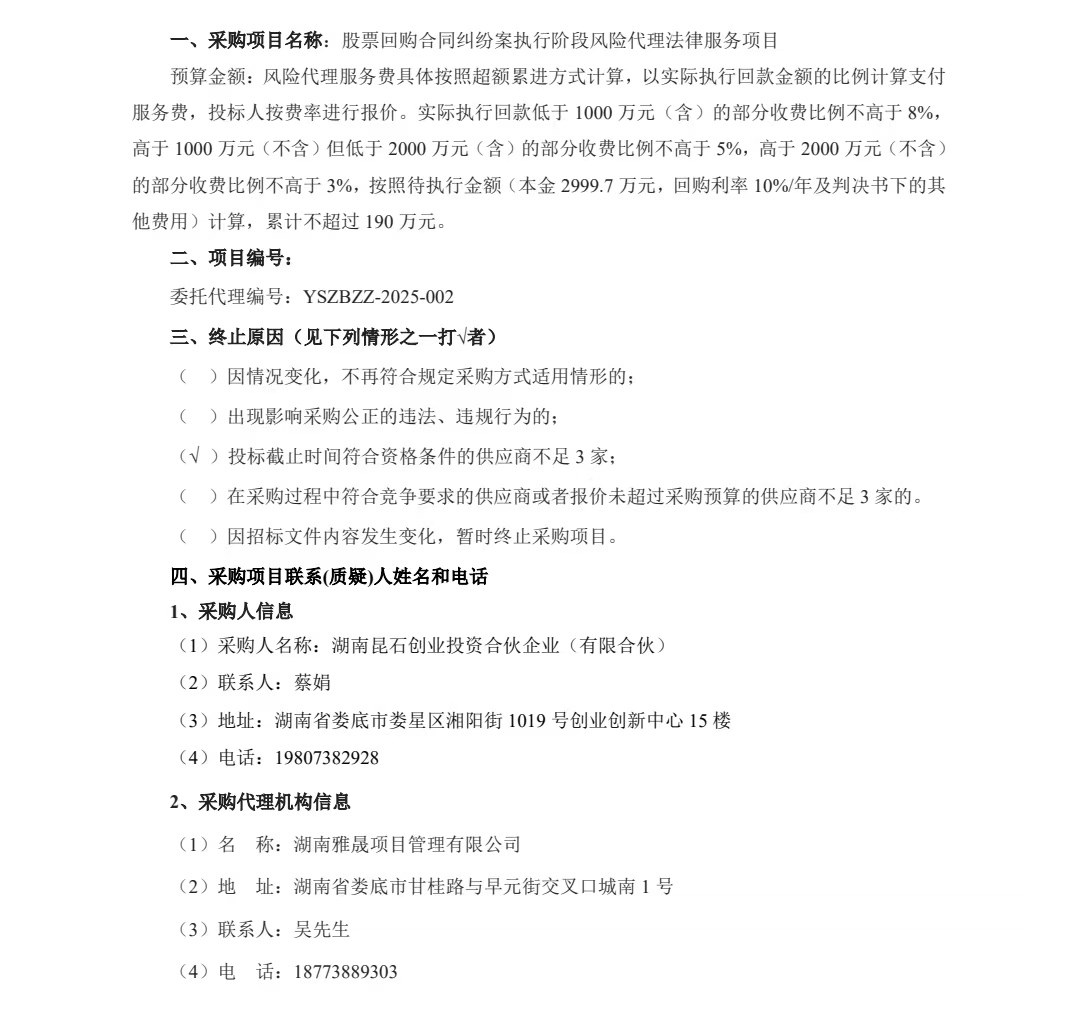 股票回購合同糾紛案執(zhí)行階段風(fēng)險代理法律服務(wù)項目終止公告