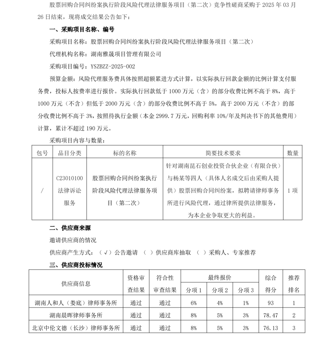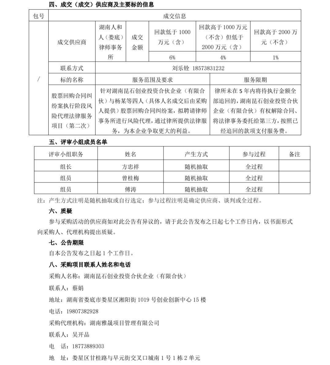 股票回購(gòu)合同糾紛案執(zhí)行階段風(fēng)險(xiǎn)代理法律服務(wù)項(xiàng)目(第二次)成交結(jié)果公告