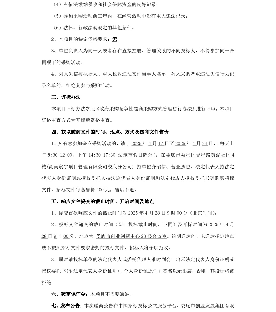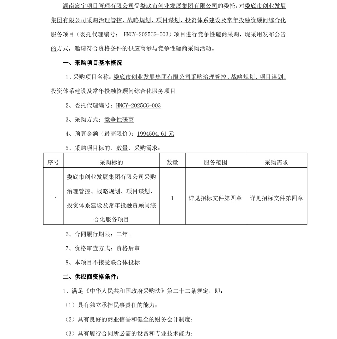 婁底市創(chuàng)業(yè)發(fā)展集團有限公司采購治理管控、戰(zhàn)略規(guī)劃、項目謀劃、投資體系建設及常年投融資顧問綜合化服務項目磋商邀請公告